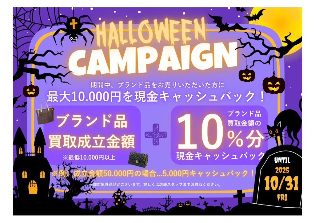 【期間限定イベント】10/1 ~ 10/31まで全てのブランド品買取時に、買取成立金額から10%分をキャッシュバックさせて頂きます。 (適用条件は買取金額が10,000円以上からになります)